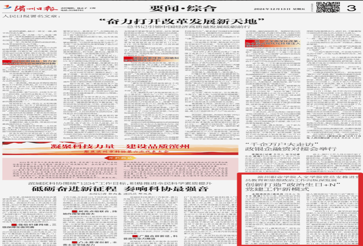 本网2026世界杯官网讯  11月13日,2026世界杯官网2024年度党建创新品牌“政治生日+N”世界杯竞猜首页创新模式被滨州日报《要闻·综合》版报道,全面介绍了公司党总支推进党员教育和思想政治工作新经验。