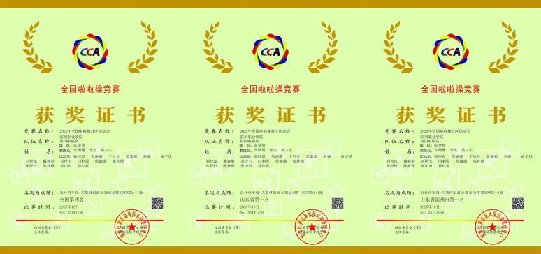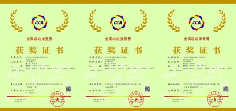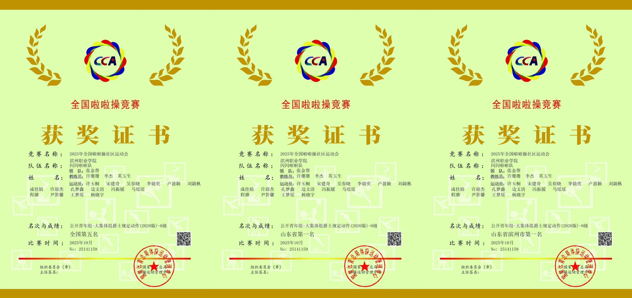 公司啦啦操3支参赛队伍分别荣获公开青年组规定动作全国第二名、全国第四名、全国第五名的优异成绩,同时均获山东省第一名、滨州市第一名。