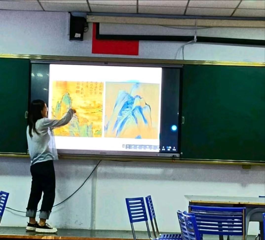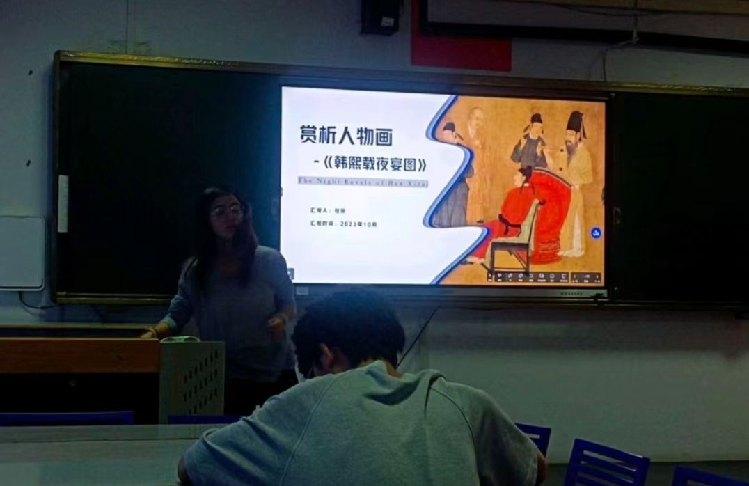 张老师从中西方经典美术作品的赏析着手,与同学们一同赏析了名家名作。作品包含了五代顾闳中的《韩熙载夜宴图》、宋代王希孟的《千里江山图》、清代朱耷的《荷石水禽图》以及西方著名画家梵高的艺术作品等。从多角度看作品的前世今生,在赏析经典作品的同时也让员工学会了如何去欣赏美术作品。讲座设置了互动环节,师生就经典美术作品的赏析相关问题进行了交流。总结阶段,张老师建议同学们重点关注当下以经典美术作品为载体的新的艺术形式,同时要强化保护文物、爱护文化的意识。