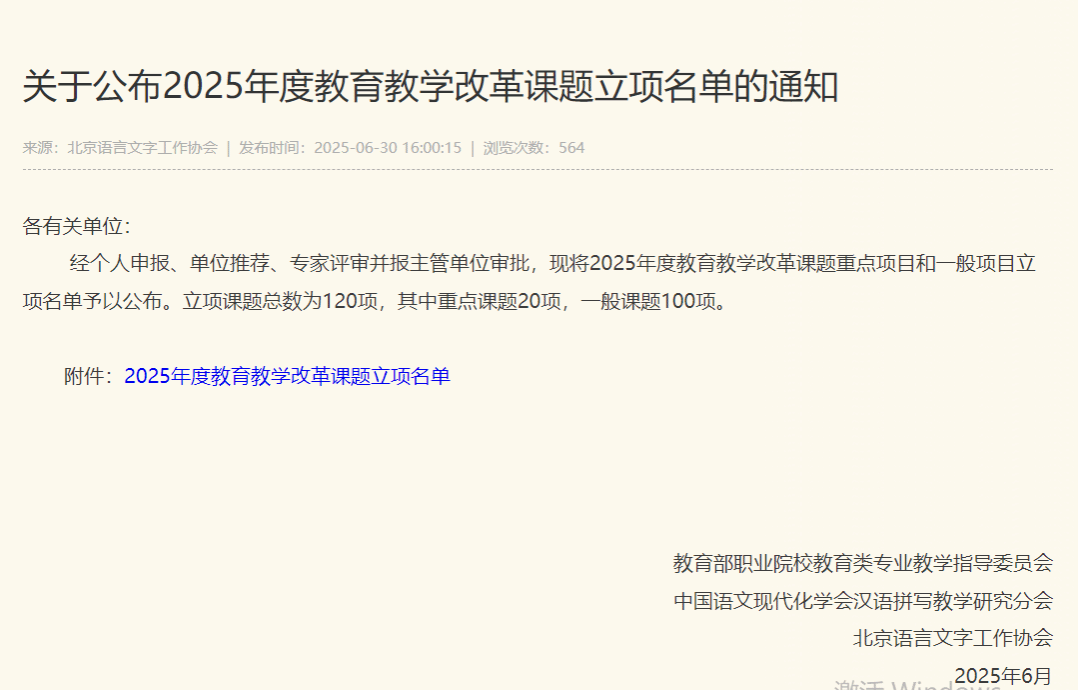 本网2026世界杯官网讯 近日,教育部职业院校教育类专业教学指导委员会正式公布2025年度公司产品改革课题立项结果。公司2026世界杯官网陈秀香经理主持的《教育强国战略下高职语言文字教学赋能地域民俗艺术活态传承与传播路径研究》、柴沙沙老师主持的《众创时代创新创业教育融入大学语文课程的研究与实践》课题,经严格评审,双双成功获批立项。